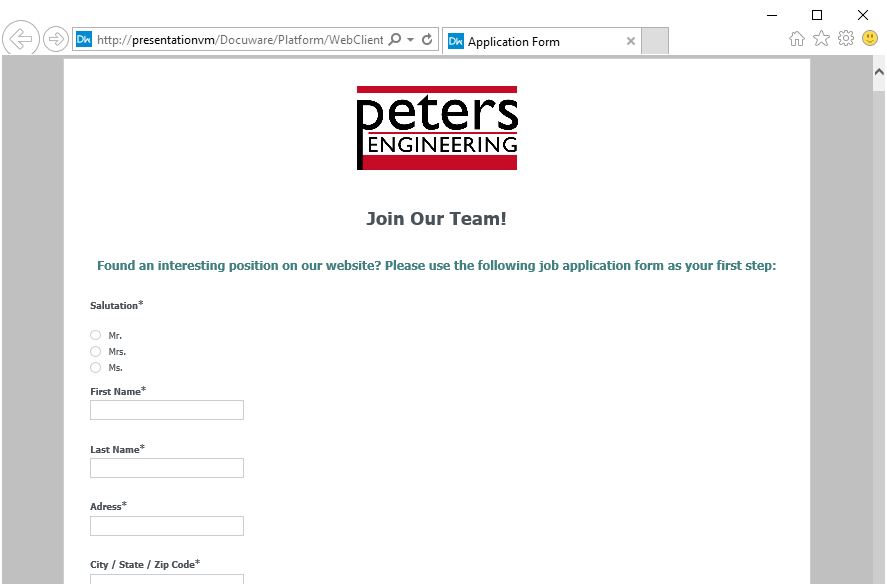 A seconda delle esigenze del flusso di lavoro di reclutamento del vostro reparto risorse umane, questo modulo Docuware può essere adattato e ampliato a seconda delle esigenze. Alla voce Autorizzazioni, selezionate la casella per renderlo un modulo pubblico. Al termine del processo di configurazione del modulo, riceverete un URL che potrete inserire nella vostra pagina di carriera, ad esempio dietro un campo di testo “Candidatura online”.